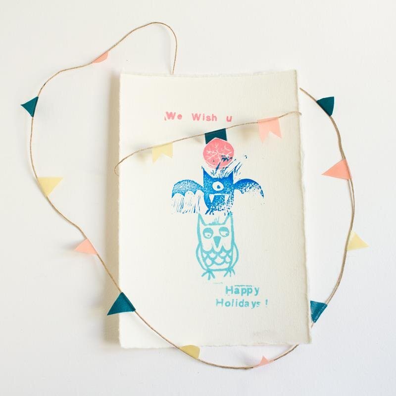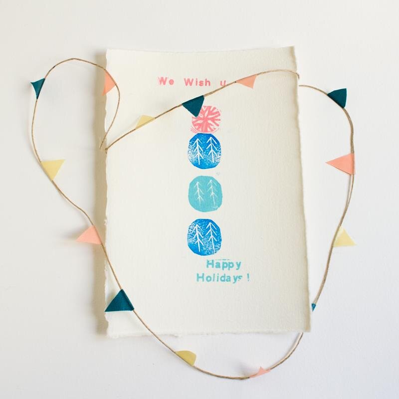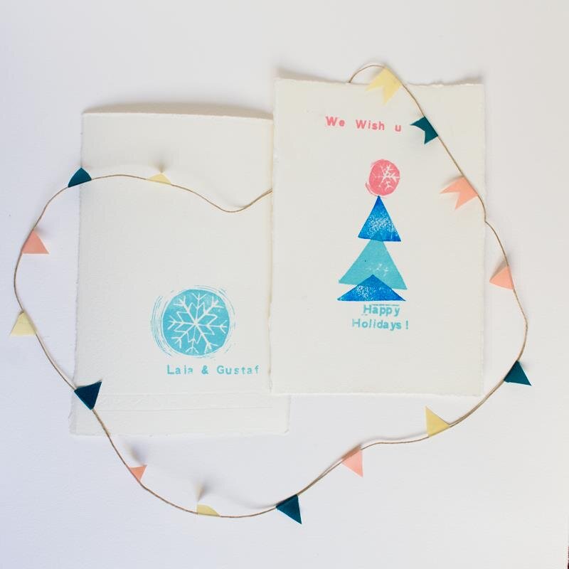 Handmade greetings cards made with rubber stamps printed with acid free & waterproof ink on HahnemĂĽhle paper, handmade garland with washi tape & cord.